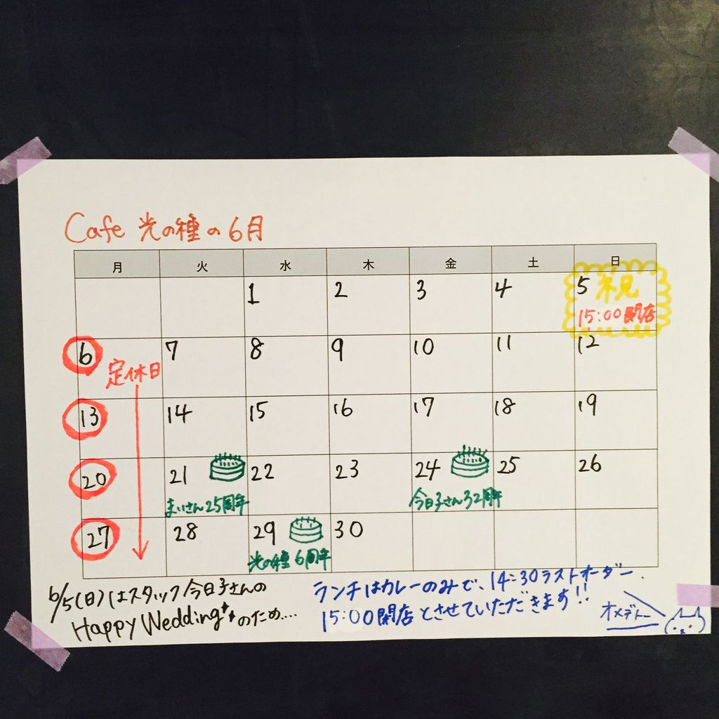 2016年06月02日 【お知らせ】6月の光の種 【カフェ光の種から、6月のお知らせ】 ◎6月5日(日)は、我らがスタッフ今日子さんの結婚式の為、ランチは酵素玄米のカレーのみ、14時半ラストオーダーの15時閉店とさせていただきます! ◎6月の定休日は、毎週月曜日(6、13、20、27)です。 ◎6月は、仲間のお誕生日がたくさん! 21日は、まいさんの生誕25周年、 24日は、今日子さんの生誕32周年 そして29日は、おかげさまでカフェ光の種が6周年を迎えます! なんともおめでたい6月の光の種。 どうぞ来月もよろしくお願いします◎ 「お知らせ」カテゴリの最新記事 < 前の記事次の記事 >