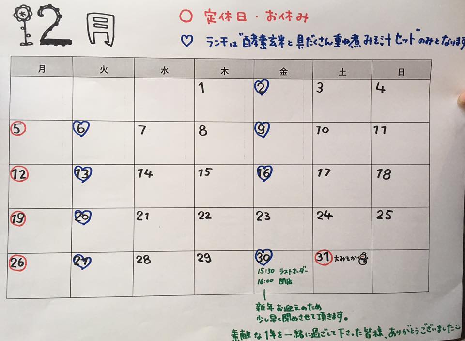 ・12月も引き続き、火・金曜日は「レッツ 解毒デー!」酵素玄米と具沢山重ね煮おみそ汁のセット(650円)のみとなります。